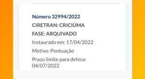 Um condutor de Criciúma recebeu a notificação de instauração de processo de suspensão do direito de dirigir (processo nº 32994/2022), em razão do acúmulo de pontos na CNH. O processo foi instaurado em 17/04/2022, com prazo para defesa até 04/07/2022.